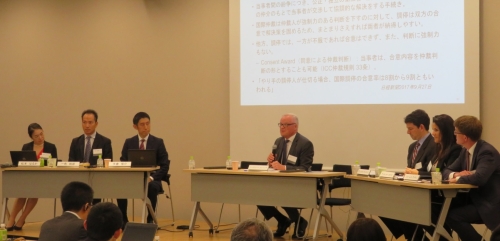 本セミナーでは、国際仲裁の最前線で活躍されている仲裁人の方々等を招へいし、ライセンス契約をめぐる国際的な紛争を事例として取り上げ、国際仲裁・調停がいかに迅速かつ実効性のある解決手段を提供することができるかについて、模擬仲裁・調停を実演しました。